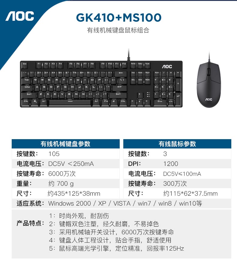 AOC GK410+MS100機械鍵盤鼠標(biāo)套裝 有線鍵鼠套裝 游戲辦公 電腦筆記本鍵盤 全尺寸 黑色 青軸¥109.00